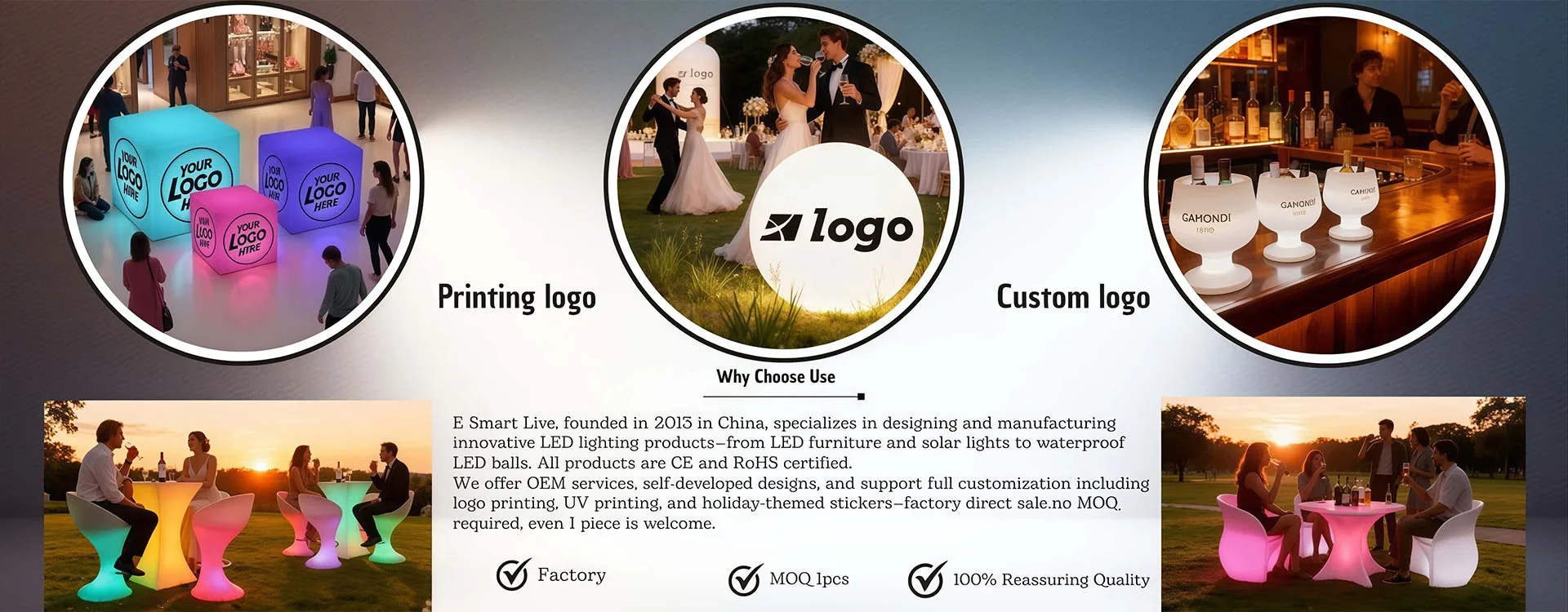 E Smart Live Technology Co.,Lt factory. was founded in 2013. located at China. We are specializing in led Furniture and customer new concept products design, which integrated research and development, can open the mold, manufacturing and sales. Products are Party furniture, floor lamp, ball light, speaker and led lights. Our products have passed CE, RoHS, certificates. We accept the OEM and ODM. If you have any good ideas, just tell us. We adhering to the principle of " “Win-Win "Cooperation, Mutually Beneficial Cooperation ". All kinds of colors and size options. Light Up Furniture - Chairs & Tables - Rechargeable and portable light up furniture that can be used indoors or out. Great in the garden or party Our light furniture is priced per product. The more you order of the same product, the lower the price is per item. For an example,the price for our light furniture will be lower if you want to order 40 bar tables instead of just 5. most items no minimum order requirement. We transport directly from the factory to the closest sea port. and can be EXW. FOB. DDP etc We will get back to you when you send us inquiry with the best price per item and also the best price for transport by boat. Should you have any questions , you are very welcome to contact us.